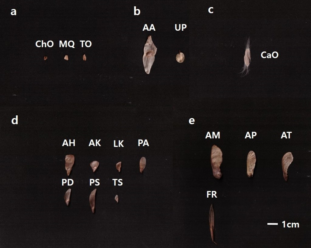- Lee S, Lee S, Kim H S, Chung S, Chung, J, Yoon TK*. 2022. Terminal velocities and falling patterns correlated with morphology of diaspores in wind-dispersed forestry species. Trees 36(6):1865–1879 doi.org/10.1007/s00468-022-02334-9